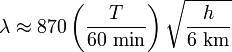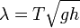 La période spatiale ou longueur d'onde est le plus souvent comprise entre 60 km (période de 10 min et profondeur de 1 km), typique des tsunamis locaux non tectoniques, et 870 km (période de 60 min et profondeur de 6 km), typique des tsunamis d'origine tectonique. Vitesse de propagation ou célérité Pour les tsunamis de période suffisamment longue, typiquement une dizaine de minutes, soit la plupart des tsunamis d'origine tectonique, la vitesse v de déplacement d'un tsunami est fonction de la seule profondeur d'eau h :