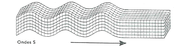 - L'onde S se propage en cisaillant les roches latéralement à angle