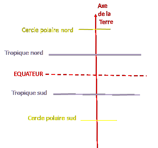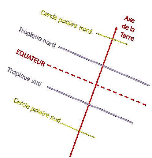 - L'axe de la Terre est incliné de 23° 26' par rapport à la normale à la direction des rayons du Soleil.