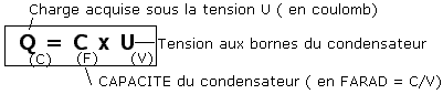 La charge Q de l'armature A d'un condensateur est proportionnelle à la tension U entre ses bornes A et B. Le coefficient de proportionalité s'apelle la CAPACITE du condensateur