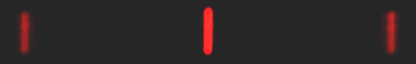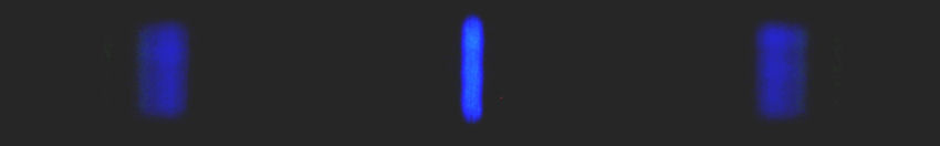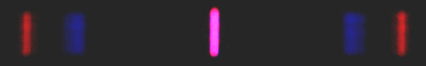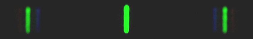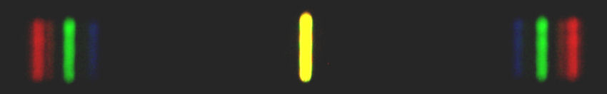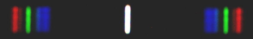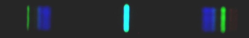 En utilisant un spectroscope constitué d'une fente et d'un réseau de diffraction à 800 traits par mm, on peut photographier le spectre de la lumière émise par chaque luminophore.
