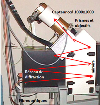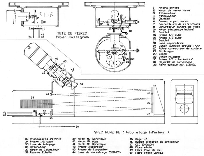 fonctionnement: La lumière provenant du télescope, guidée par une des fibres optiques, est décomposée par un réseau de diffraction puis passe par une série de miroirs et de prismes pour arriver sur le capteur CCD du spectrographe . Pour calibrer l'appareil, un spectre de référence du thorium est utilisé.