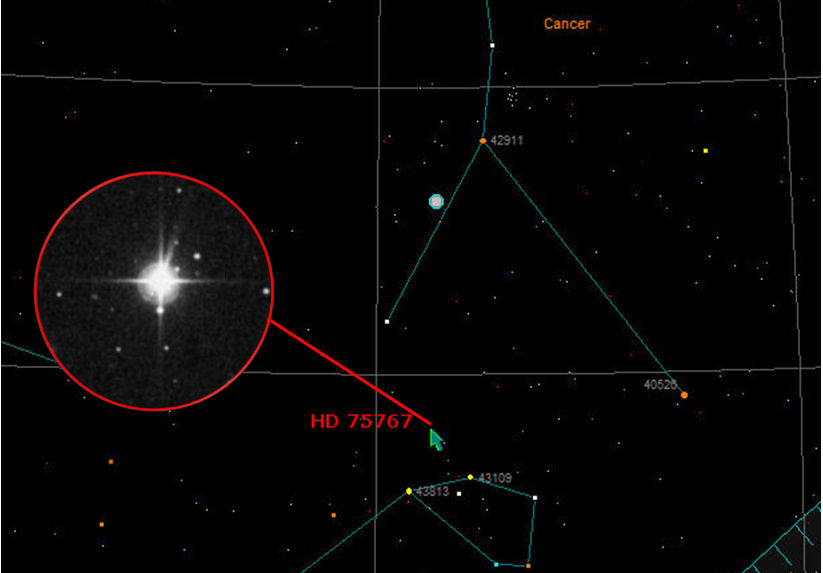 L'étoile HD 75767 fait partie d'un système quadruple dans la constellation du Cancer et situé à environ 75 al.