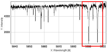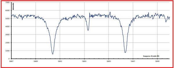 | On choisit de mesurer le décalage des deux raies du sodium λ1 = 5889,950 Ǻ (588.9950 nm) et λ2 = 5895,924 Ǻ ( 589.5924 nm) | |||