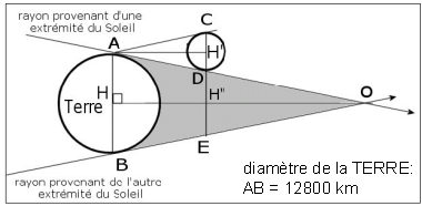 L'angle au sommet que fait le cone d'ombre de la Terre est de 0.5° ( c'est l'angle sous lequel on voit 2 rayons extrêmes du Soleil). On montre donc facilement que la longueur OH du cone d'ombre est 114 x diamètre de la Terre. Connaissant le rapport r = DE/CD mesuré avec les cercles tracés et en utilisant les triangles semblables, on montre que la distance Terre-lune AH = AB x 114/(r+1). Toujours à l'aide des triangles semblables, on montre que le diamètre de la Lune CD = AH'xAB/OH. Pour vérifier les résultats : |