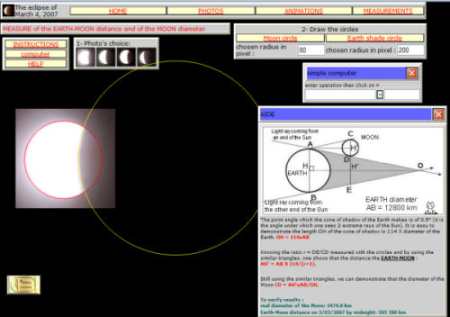 CirconstancesLors d'une "portes ouvertes" , j'ai réalisé avec des collègues d'anglais un TP basé sur l'éclipse de Lune du 3 mars 2007. J'ai donc traduit mes pages sur l'éclipse et bati un texte support pour un travail d'une durée d'une heure. Les élèves et les profs ne devaient s'exprimer qu'en anglais et la rédaction des réponses ne devait s'exprimer qu'en anglais.CONTENULes questions ont abordé plusieurs sujet étudiés en seconde : les mesures de distance, la réfraction et la dispersion de la lumière, les référentiels et la compréhension du phénomène d'éclipse.BUTLe but final était de déterminer par des mesures et des calculs, directement dans les pages web, le diamètre de la lune et la distance Terre-LuneDOCUMENTS