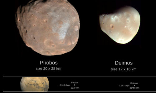 Mars est une planète tellurique comme la Terre mais beaucoup plus petite, son rayon est d'environ 3400 km. Elle possède 2 petits satellites de forme irrégulière.