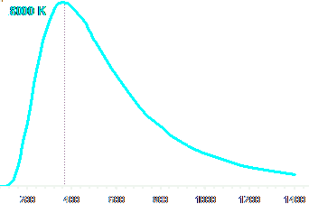 - un corps noir à 5000K apparaîtra orangé car la puissance rayonnées est plus grande du coté du rouge que du coté du bleu.