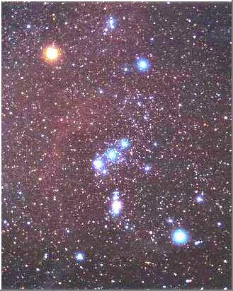 | Suivant la longueur d'onde où l'émission de lumière est la plus forte, l'étoile apparaîtra plutôt rouge ou plutôt bleue comme ici dans la constellation d'ORION avec RIGEL étoile très chaude ou BETELGEUSE étoile plus froide. |
