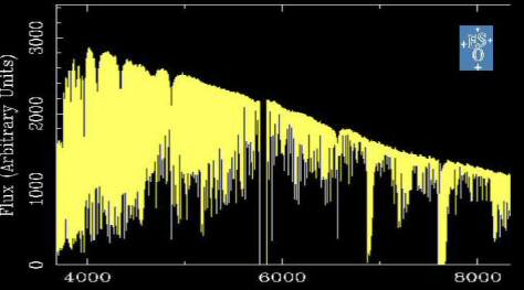 La lumière émise par la surface d'une étoile donne un spectre continu. C'est donc un spectre d'origine thermique comme celui du filament d'une ampoule.Ce spectre est parsemé de raies d'absorption car la lumière émise traverse l'atmosphère de l'étoile qui absorbe certaines longueurs d'ondes. |