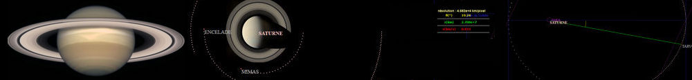 | Les satellites de SATURNE | :Quelques satellites majeurs (Mimas, Encelade, Tethys, Dioné, Rhéa) à orbite quasi-circulaire et un autre satellite (Tarvos) à orbite elliptique. |
