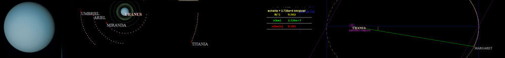 | Les satellites d'URANUS | : les satellite majeurs d'Uranus( Miranda, Ariel, Umbriel, Titania et Obéron) à orbite circulaire et un autre satellite (Margaret) à orbite elliptique. |