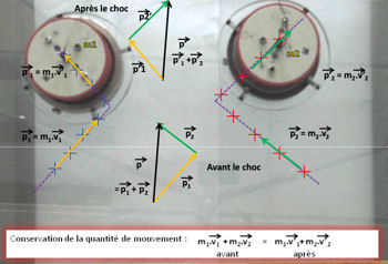 qtemvt.swf : animation conservation de la quantité de mouvement à partir d'une vidéo d'un choc élastique.